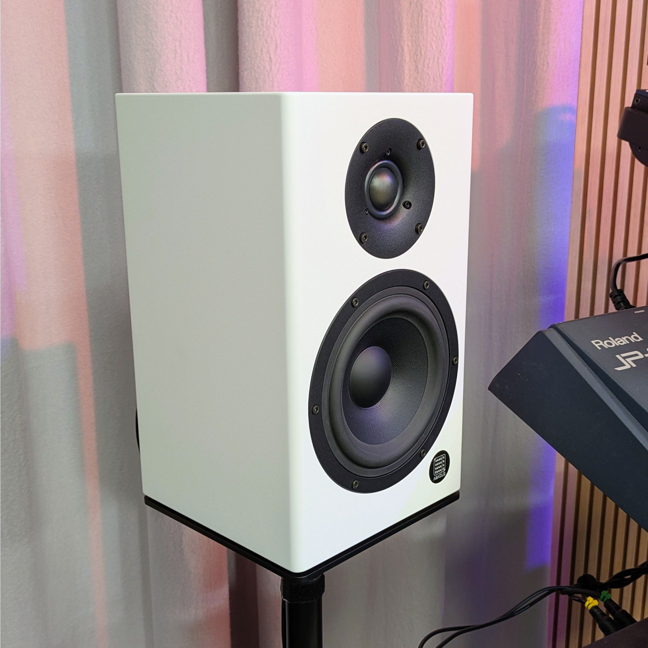 Zum Einsatz kommt ein 6,5-Zoll-Tieftöner mit leichter Papiermembran und kräftigem Antrieb sowie ein 1,2-Zoll-Kalottenhochtöner, wie er auch in der Mirra 14, Mirra 15 und Pivota 42 arbeitet. Die Trennfrequenz liegt bei rund 1250 Hz – außergewöhnlich tief für diese Größenklasse – und sorgt für ein sehr homogenes Abstrahlverhalten im Nah- und Ultranahfeld.